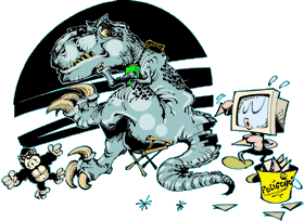 Os dinossauros do filme foram montados em computador e depois inseridos na imagem, para participar das cenas com os atores. Primeiro, é feito um modelo do bichão. Depois, estuda-se como ele vai se mover. Existem alguns softwares (programas) que ajudam a fazer com que um desenho se mova em um cenário virtual com três dimensões (altura, largura e profundidade). Mas tudo isso tem que ser programado.