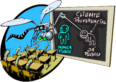 Os sintomas são bem chatos: febre alta, dores em todo o corpo, principalmente nas articulações e nos olhos, dor de cabeça, fraqueza, gânglios (pequenas bolinhas) nas axilas, náuseas, vômitos. Por isso, se você sentir esses sintomas, não perca tempo: procure um médico! Não existe remédio para a dengue. Só repouso, beber bastante líquido, e evitar remédios à base de ácido acetilsalicílico (a famosa aspirina). É que a aspirina não combina com a dengue. Apesar de baixar a febre e diminuir as dores, a aspirina diminui a capacidade de uma plaqueta aderir à outra, facilitando as hemorragias.